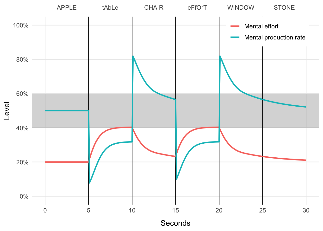 Figure 1.. Figure illustrates an imagined experiment where a participant is trying to study six words (upper x-axis) for 5 seconds each (lower x-axis). How the word is shown (all upper-case letters a mix of upper- and lower-case letters) affects task difficulty, which impacts mental production rate, which in turn affects mental effort. The grey horizontal field shows the accepted/expected production rate for the task, which the model aims for the production rate to be within. The y-axis shows the level of production rate (blue line) and level of mental effort (orange line).